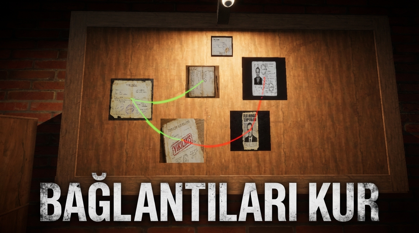 Göreviniz basit ama zeka gerektiriyor: İsimleri, adresleri, olayları ve kanıtları birbirine bağlayın. Odanın ortasındaki mantar panoda, Yeşil ipliklerle gerçeğin haritasını çıkarın.Unutmayın Yeşil iplikler doğru gittiğinizi kırmızı iplikler ise yanlış gittiğinizi gösterir. Her doğru bağlantı, kilitli bir çekmeceyi açacak ve sizi gizemin kalbine bir adım daha yaklaştıracak.